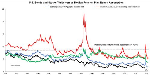 U.S. pension funds assume that they will earn 7.25% on their portfolios by mixing assets which yield less than 3% on average. Even if pension funds were to invest solely in the highest-yielding asset (junk bonds), they would still miss their target by about 200 basis points, while taking an amount of risk which would violate their fiduciary duties. Something has got to give: Either asset prices will fall massively to restore normal expected returns (which would trigger an immediate solvency crisis for most pension funds) or pension funds “will die from a thousand cuts” due to an absence of profitable reinvestment opportunities. Either way, most pension plans will fail to deliver their contractual obligations.