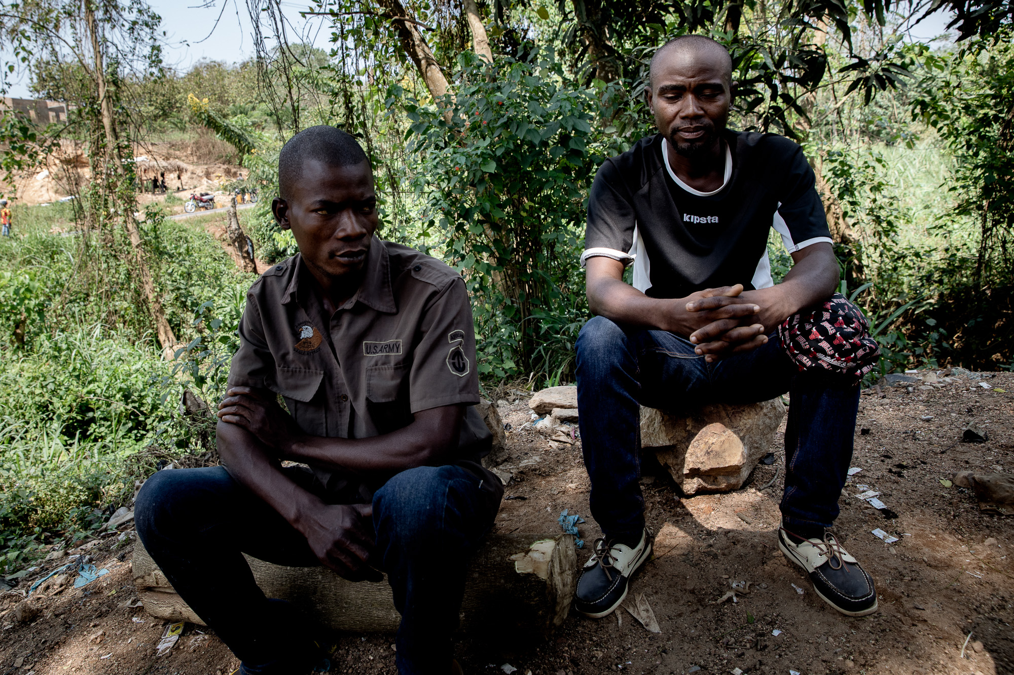 Innocent Sanzima (right) sits on a road outside Bangui.