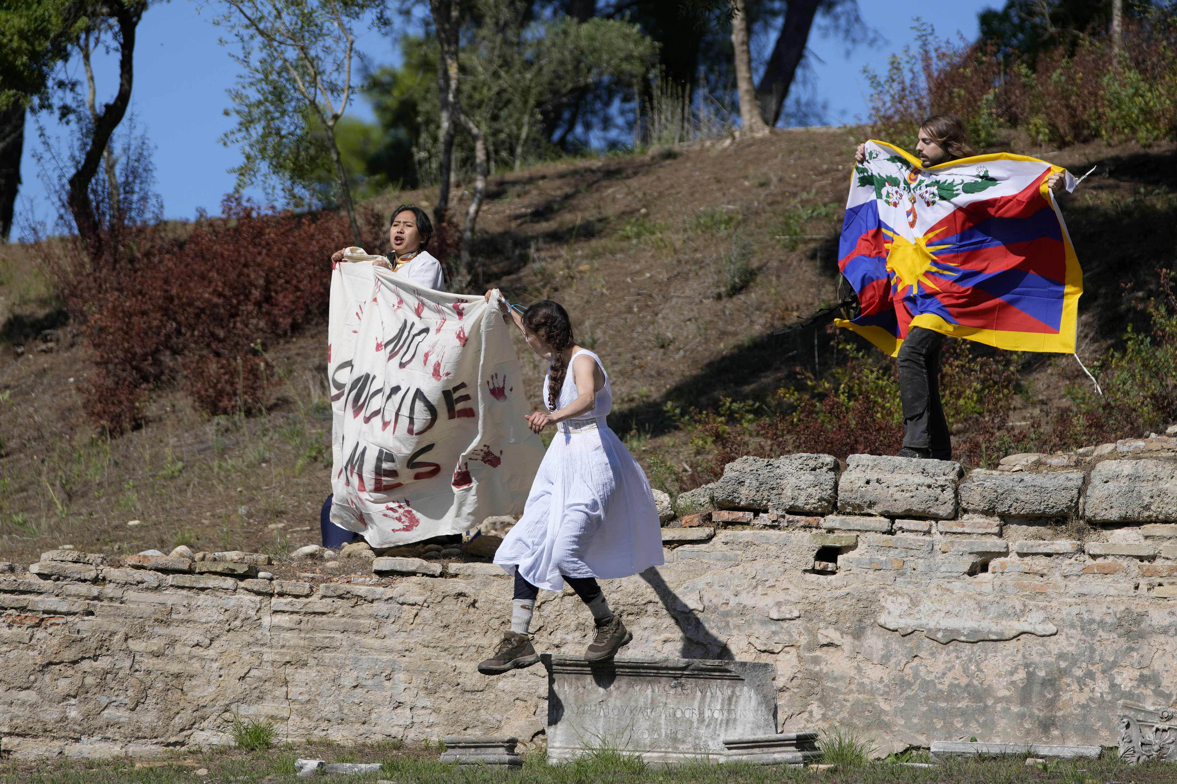 At Monday’s flame lighting ceremony in Olympia, Greece, activists grabbed the spotlight by unfurling a Tibetan flag and a banner that read “no genocide” before Greek police intervened.