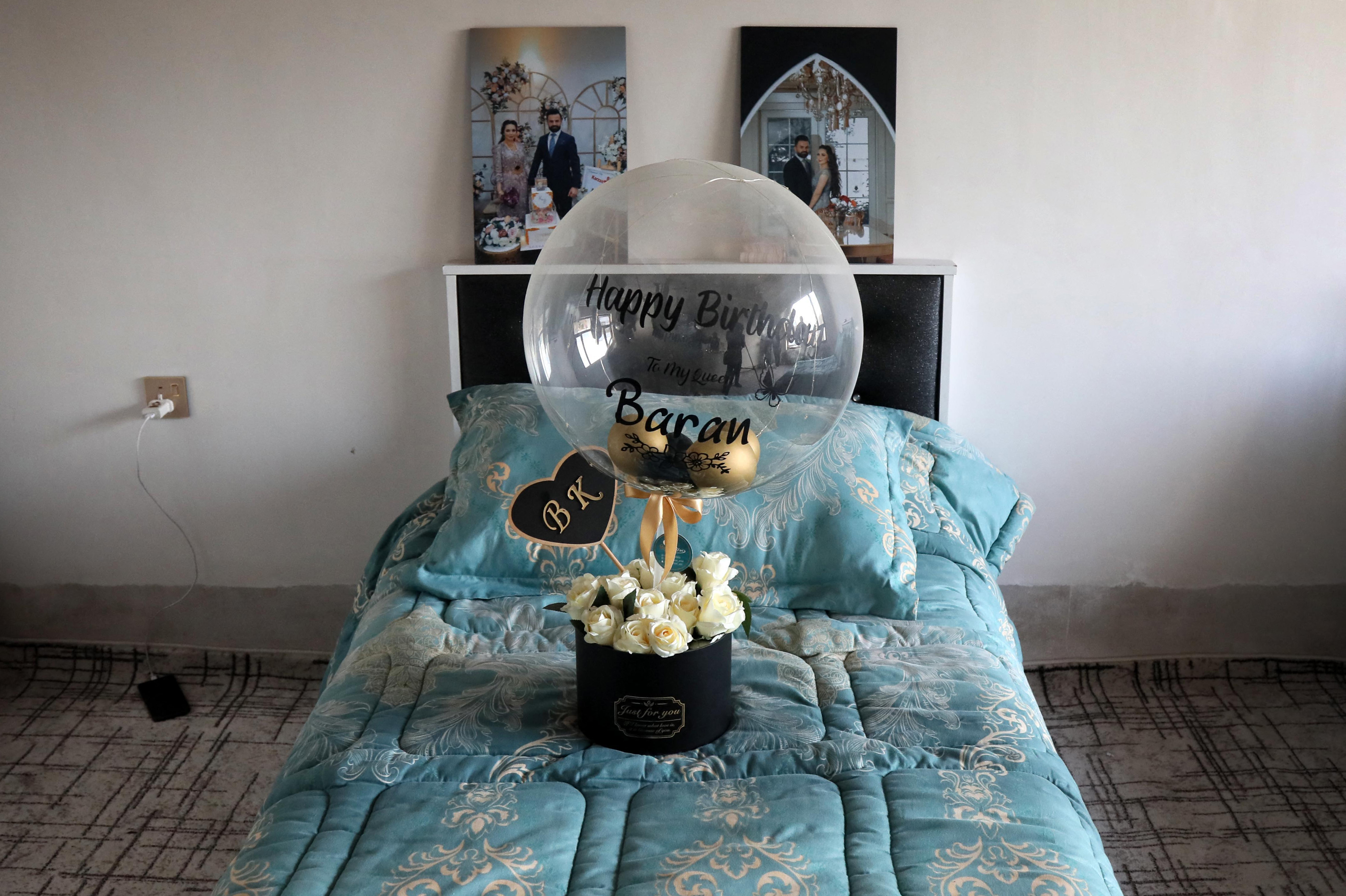 In Maryam’s room, above the bed, two photos show the young woman and her fiance at their engagement. A picture shows her in a traditional dress decorated with embroidery, with a tiara over an elaborate hairstyle. A bouquet of white roses lies on her bed.