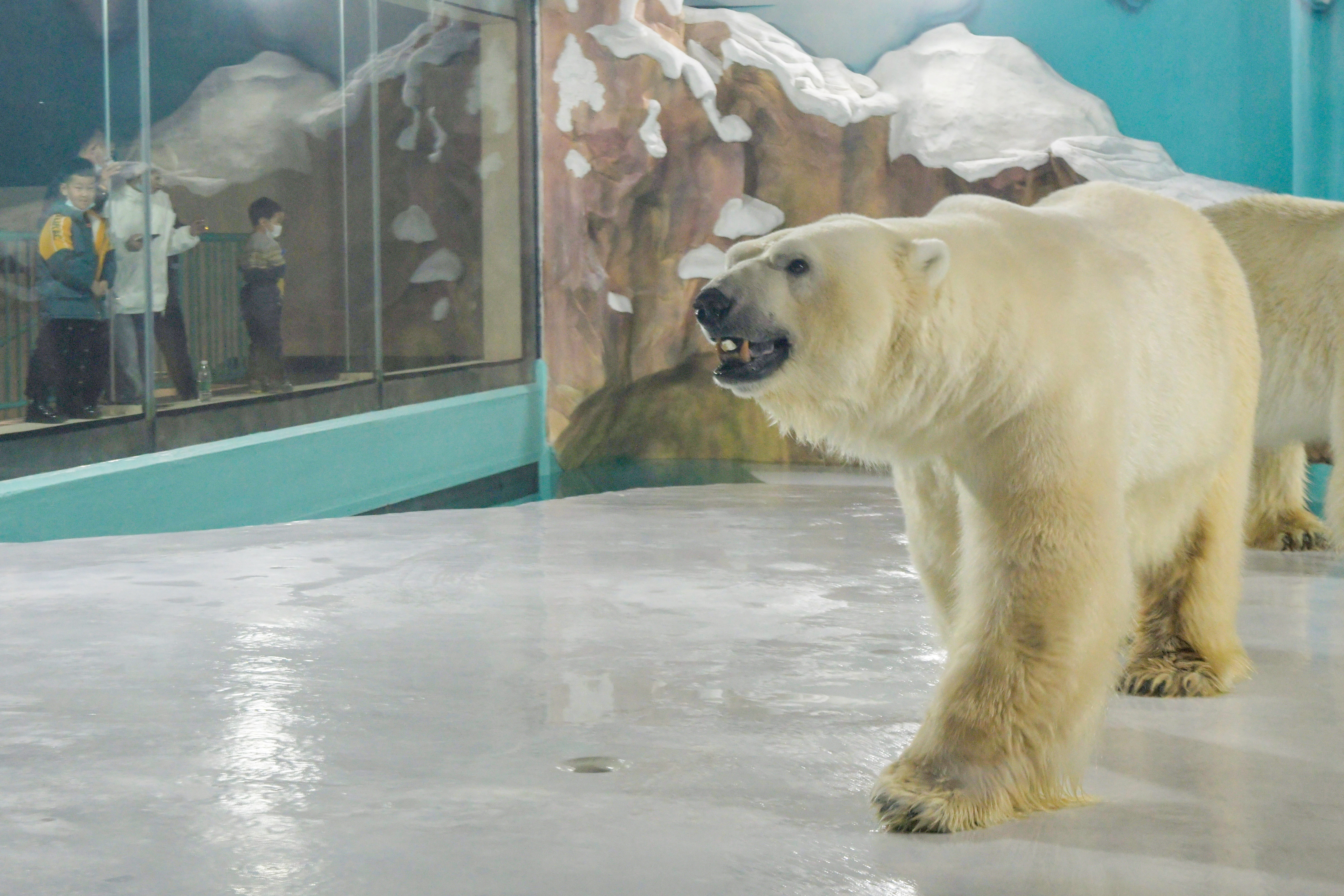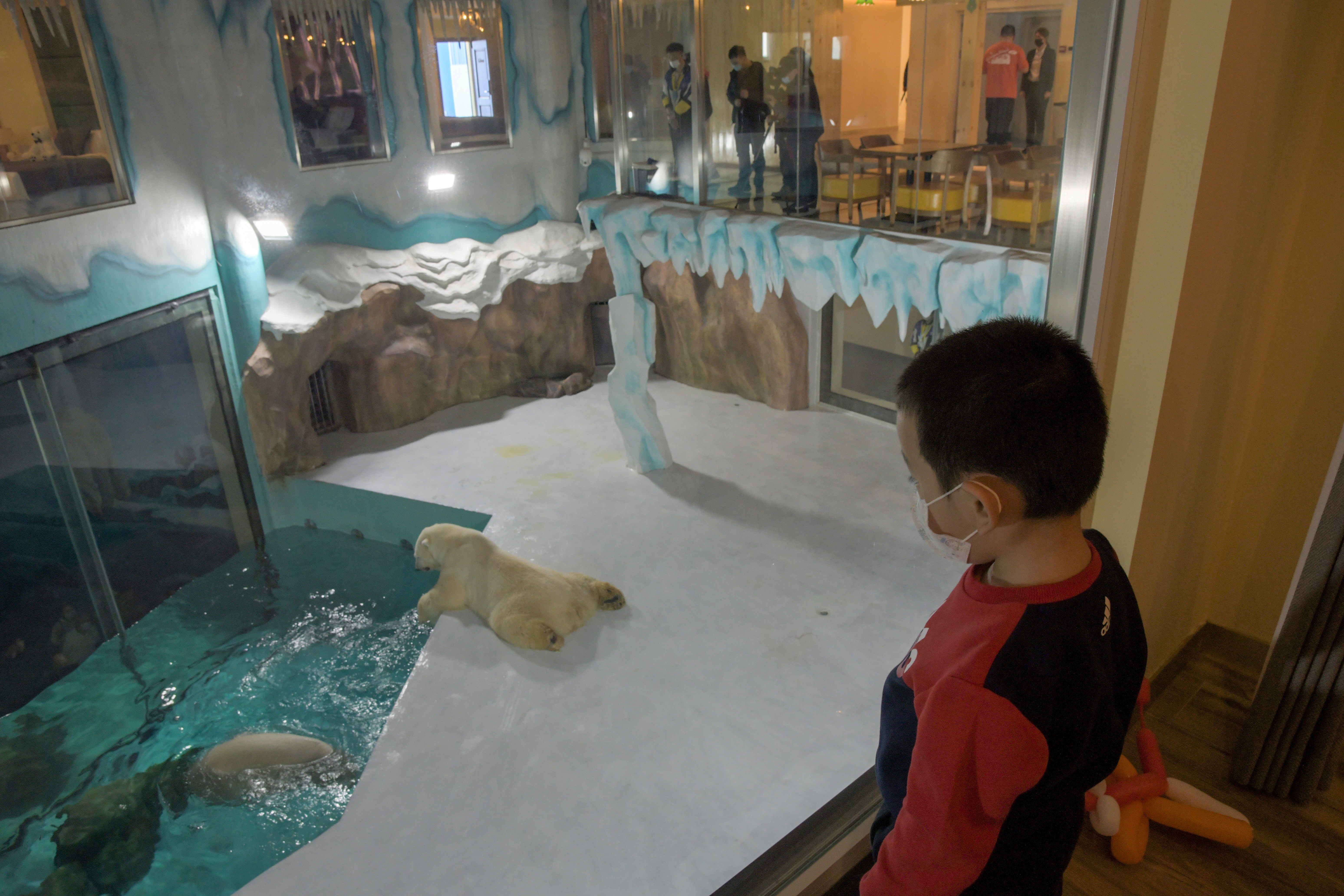 Photos and videos from Chinese state media showed people watching two polar bears in an indoor enclosure featuring artificial ice and small pools of water.