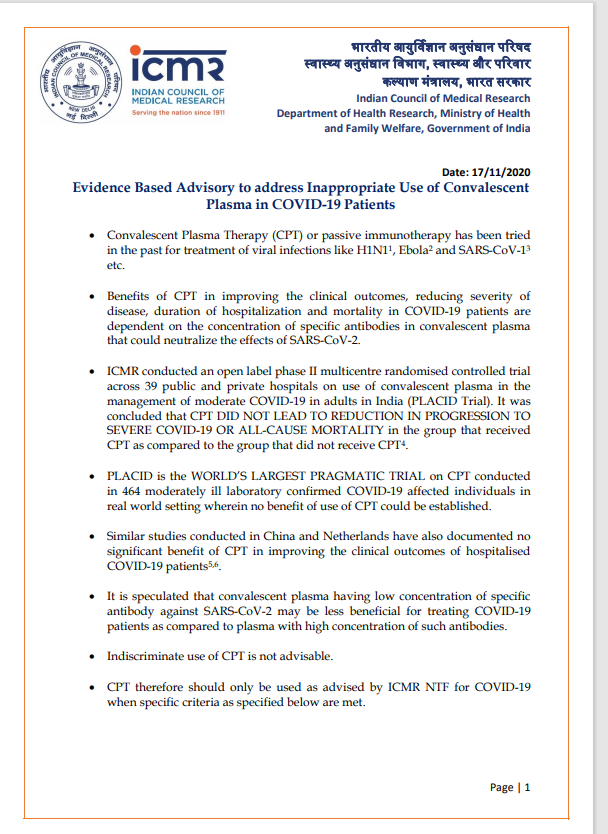 In a news release on November 17, 2020, ICMR said “PLACID, the world’s largest plasma trial, had shown no benefit of CPT in patients”.