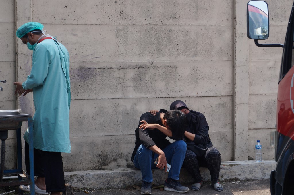 Kompas TV showed footage of firefighters trying to put out huge flames from the top of a building and the dead being brought out in orange body bags.