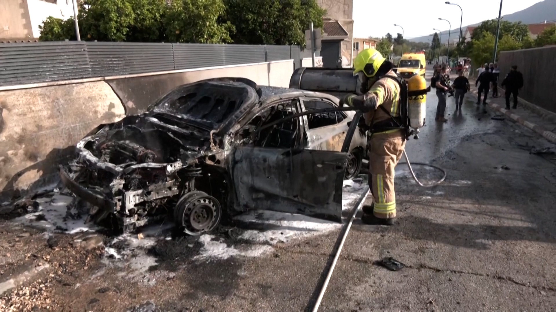 Firefighters worked to extinguish a fire after a rocket attack from Hezbollah hit Kiryat Shmona in northern Israel. No casualties were reported. The strike came hours before US President Trump’s announcement of a Lebanon-Israel ceasefire.